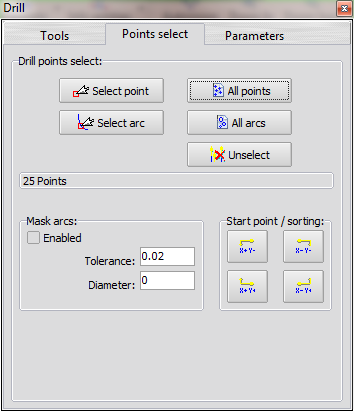 All the centers of the arcs entities, on the active layers (visible), are added to the points list of the drill cycle.