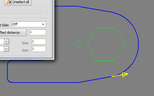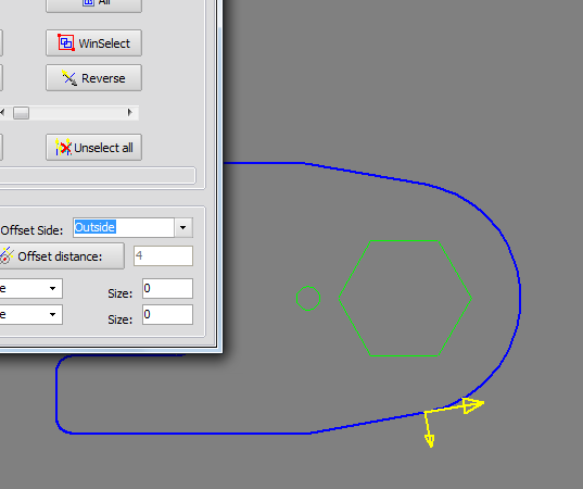 Another yellow arrow, smaller then previous, appears to indicate the direction of cutter compensation.