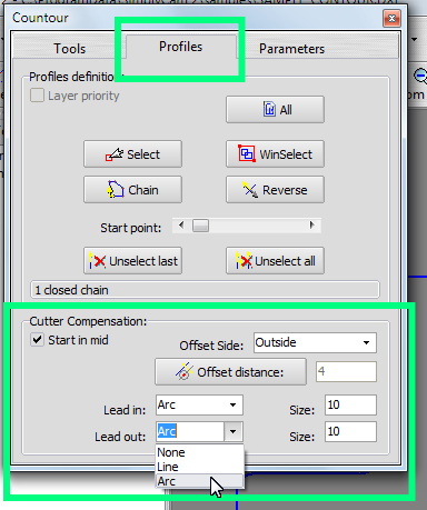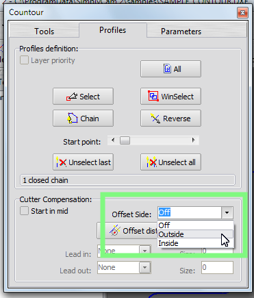 In the "Cutter compensation" section, set the "Offset Side" on OutSide.