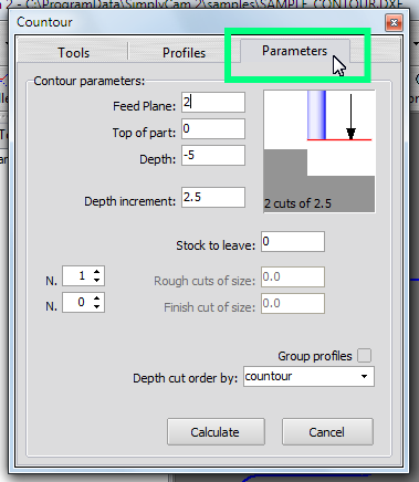 Editing operation again. Double click with mouse on the "Parameters" item. The Countour dialogs are again displayed.