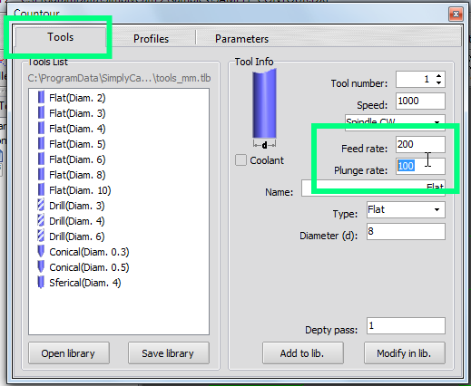 In "Tool" section set feeds and speed.