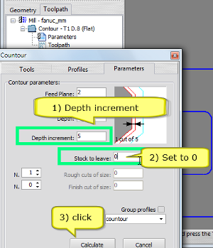 In "Parameters" section press the "Calculate" to remachining the chained geometry with the new cutting parameters.